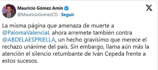 “El mismo perfil que amenaza de muerte a Paloma Valencia ahora arremete también contra Abelardo De La Espriella, un hecho gravísimo que merece el rechazo unánime del país”, expresó el congresista, al tiempo que cuestionó el silencio del senador Iván Cepeda frente a estos hechos.