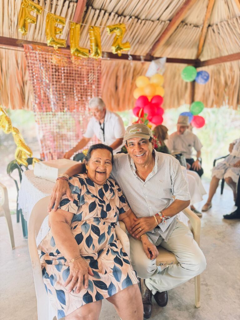 Muy cerca, la celebración toma forma de familia. Una gran fotografía la muestra rodeada de generaciones enteras, un árbol vivo que creció a su alrededor. Allí no hay prisa, solo gratitud. Y en otra imagen, bajo un techo de palma adornado con globos dorados que anuncian su edad, la fiesta se vuelve más cercana: risas, complicidades y ese calor humano que solo se siente en los pueblos.