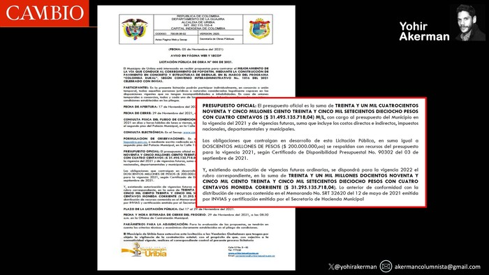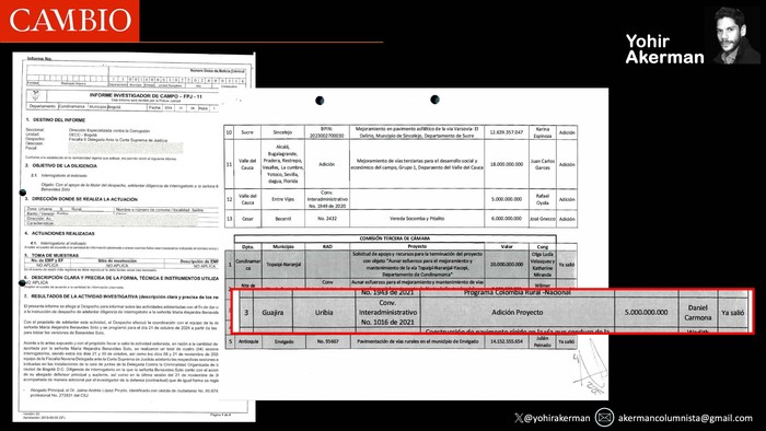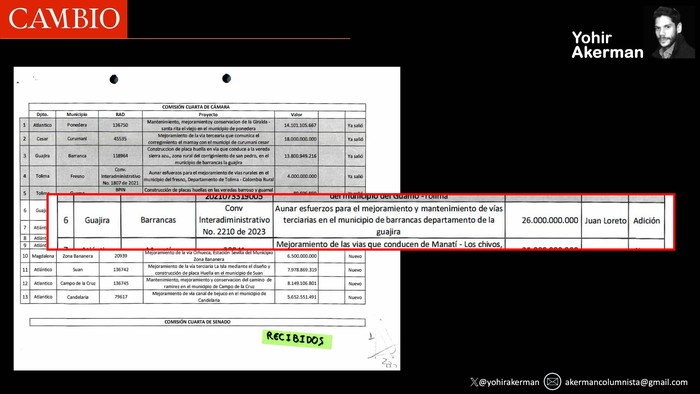 Sigamos con la vía. La obra, que une la cabecera de Uribia con el corregimiento de Poportín, fue contratada originalmente por 31.500 millones de pesos por la Alcaldía de Uribia, con recursos del Invías. Tuvo una adición por 5.000 millones de pesos que, dentro de los cuadros informativos aportados por la exasesora Benavides, aparecen asignados al congresista Restrepo Carmona.